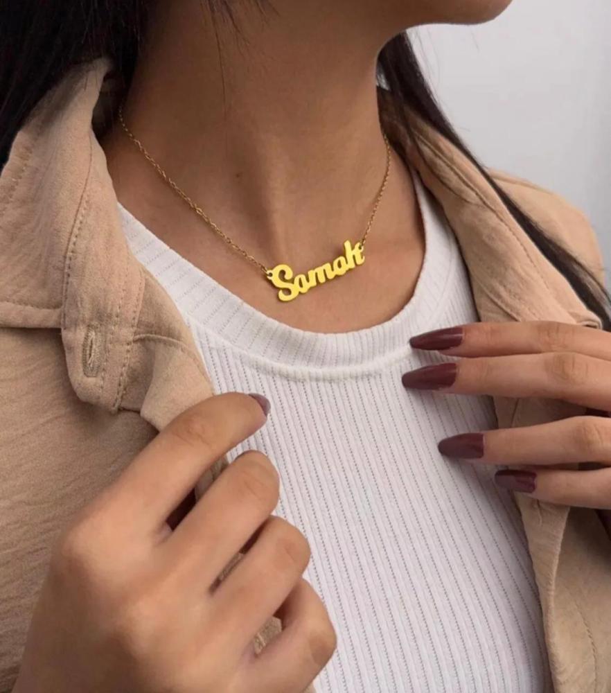 سلسال بالاسم حسب الطلبمعلومات المنتج:مطلي بالذهب عيار 21 قيراط.يمكنك تخصيص أي اسم أو كلمة (عربي أو إنجليزي).متوفر ذهبي أو فضي.